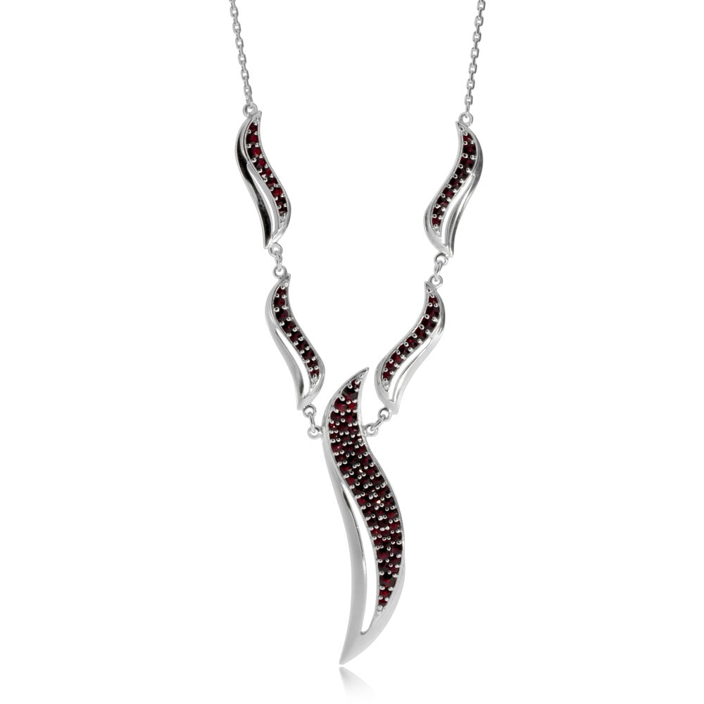 Nápadný stříbrný náhrdelník moderního designu je osazen broušenými českými granáty v pěti esovitě prohnutých článcích. Tyto články jsou uchycené na řetízku a celková délka náhrdelníku je 45 cm. Náhrdelník je vyroben ze stříbra o ryzosti 925/1000 a je na povrchu pokryt lesklým rhodiem. Tento šperk byl vyroben mistry z družstva umělecké výroby Granát Turnov a je dodáván s certifikátem pravosti od výrobce a v krabičce s jeho logem.