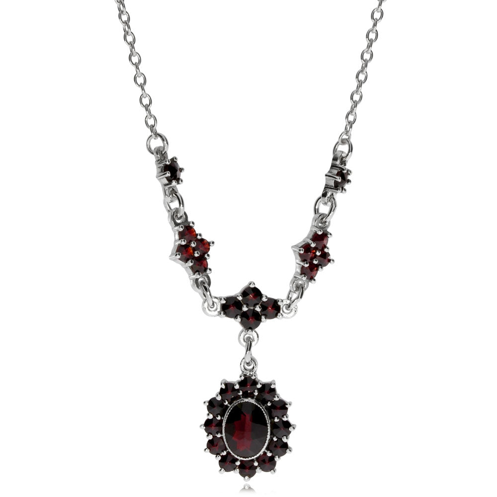 Dámský stříbrný náhrdelník patří ke klasice českého granátového šperku. Na středu náhrdelníku jsou drobné ozdoby s českými granáty, z nichž je zavěšen oválný přívěsek s větším granátem almandinem. Středový kámen je zasazen do hladké obruby, které zdůrazňuje jeho tvar. Po obvodu jsou zasazené drobnější české granáty vybroušené kulatým hvězdovým brusem a zasazené do malých krapen. Celkově náhrdelník působí slavnostním dojmem a velmi pěkně se bude vyjímat ke společenským šatům s výstřihem do tvaru V. Délka řetízku je 42 cm a samotný přívěsek měří více než 2,5 cm. Tento český granátový šperk je z dílen mistrů družstva umělecké výroby Granát Turnov a je dodáván s certifikátem pravosti a v krabičce s logem výrobce.