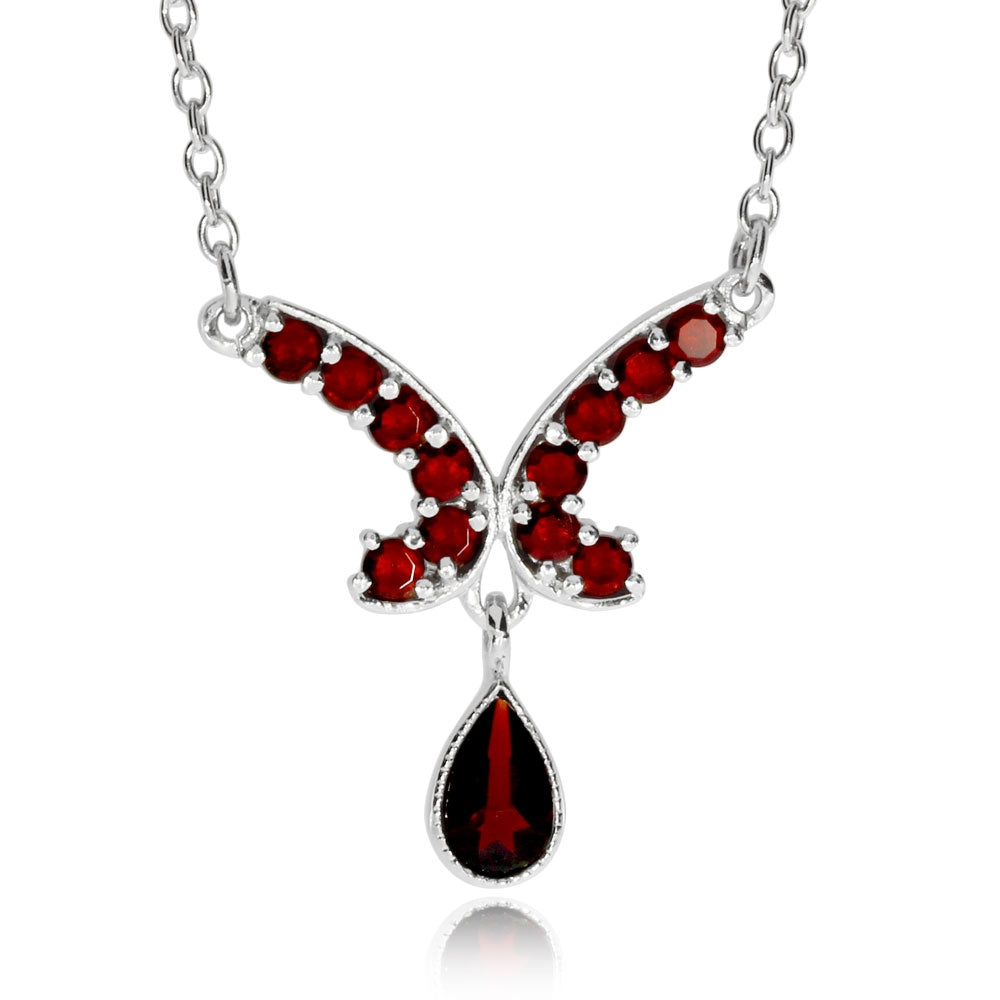 Dámský náhrdelník pro slavnostní chvíle je vyroben ze stříbra o ryzosti 925/1000, které je galvanizováno bílým lesklým rhodiem. Zdobná část náhrdelníku se pyšní dvanácti drobnými českými granáty a větším přírodním granátem almandinem, který je vybroušen do tvaru elegantní kapky. Náhrdelník má délku 45 cm s možností regulace. Tento český granátov šperk je dodáván s certifikátem pravosti od výrobce, kterým je družstvo umělecké výroby Granát Turnov.