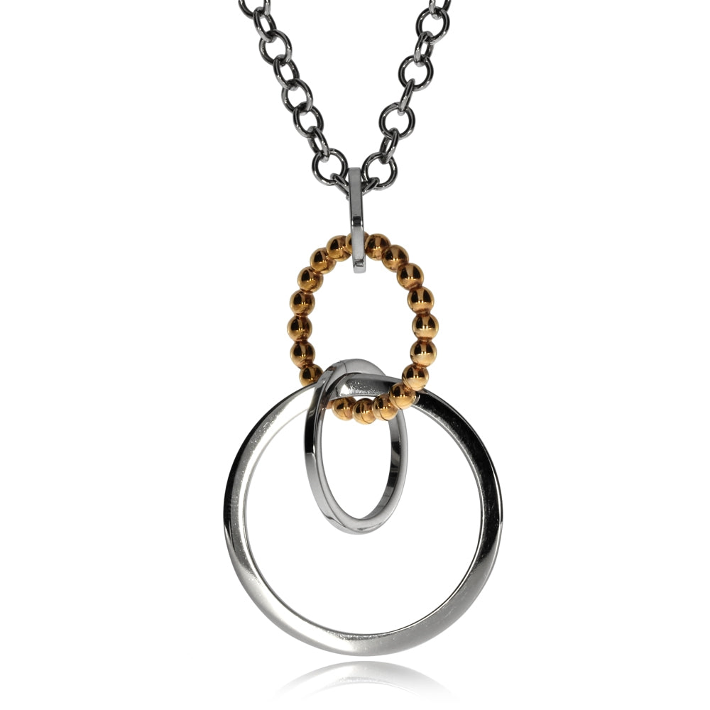 Působivý dámský náhrdelník Morellato, který upoutá pozornost svým osobitým zpracováním a neobyčejnou kombinací dvou barev kovu. Náhrdelník je vyrobený z chirurgické oceli se speciální úpravou, která umožňuje různé zbarvení kovu. Na jemném řetízku s jednoduchým vzorem spočívá ozdoba tvořená několika propletenými kruhy různé velikosti, na jejichž povrchu skvěle vyniká elegantní linie a zářivá ocel. Jeden z kruhů je potom zpracovaný v barvě champagne a působí jako složený z malých kuliček. Spolu s tímto náhrdelníkem najdete v naší nabídce i další šperky Morellato s obdobným designem, společně tak mohou tvořit luxusní šperkařskou sadu.