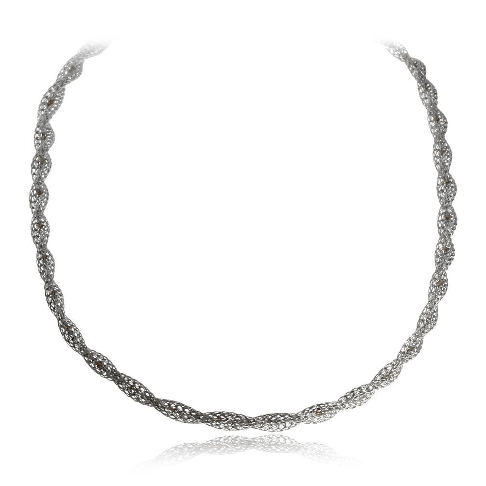 Velice pěkně zpracovaný dámský náhrdleník, který představuje nadčasovou eleganci a minimalismus, který se hodí k různým módním stylům i příležitostem. Náhrdelník tvoří dvě kulaté pleteniny utkané ze stříbrných nití. Vyrobený je ze zářivého rhodiovaného stříbra.