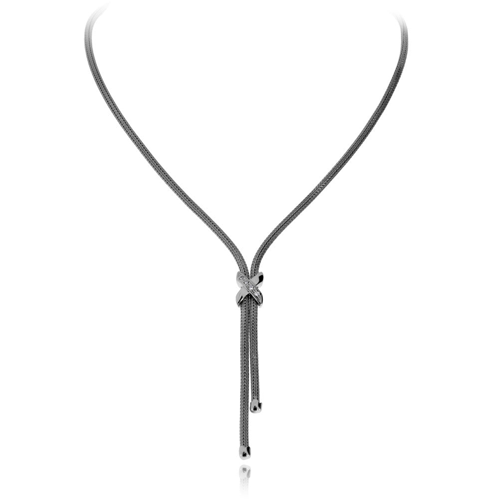 Okouzlující dámský náhrdleník, který bude skvělou ozdobou pro každodenní nošení. Náhrdelník tvoří kulatá pletenina utkaná ze stříbrných nití, která se na středu spojuje v jednoduché ozdobě poseté čirými syntetickými zirkony (cubic zirconia), ty se jemně třpytí.