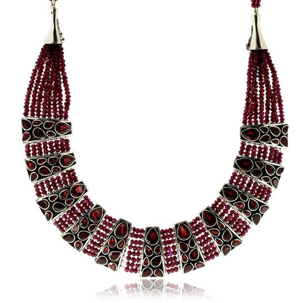 Úchvatný dámský náhrdelník, který působí jako by pocházel z vzácné truhly plné drahokamů. Náhrdelník je poskládaný z broušených kuliček červeného granátu almandinu. Několik řad kuliček doplňují ozdobné články vyrobené ze starostříbra, do kterých jsou vsazené další almandiny ve tvaru kapky. Vzniká tak okouzlující efekt, který zdobí tento luxusní šperk.