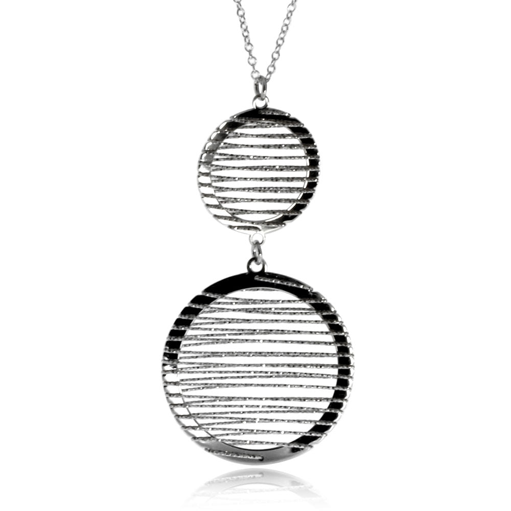 Dámský náhrdelník ze stříbra s nápadnými přívěsky - dvěma kruhy s provlečenými stříbrnými drátky upoutají pozornost zejména žen, které si nepotrpí na konvenční šperky. Větší z kruhů má průměr téměř 3,5 cm a délka obou přívěsků přesahuje 7 cm, je tedy třeba počítat s tím, že se jedná o nápadný šperk, který se bude velmi dobře vyjímat na tmavém podkladu.