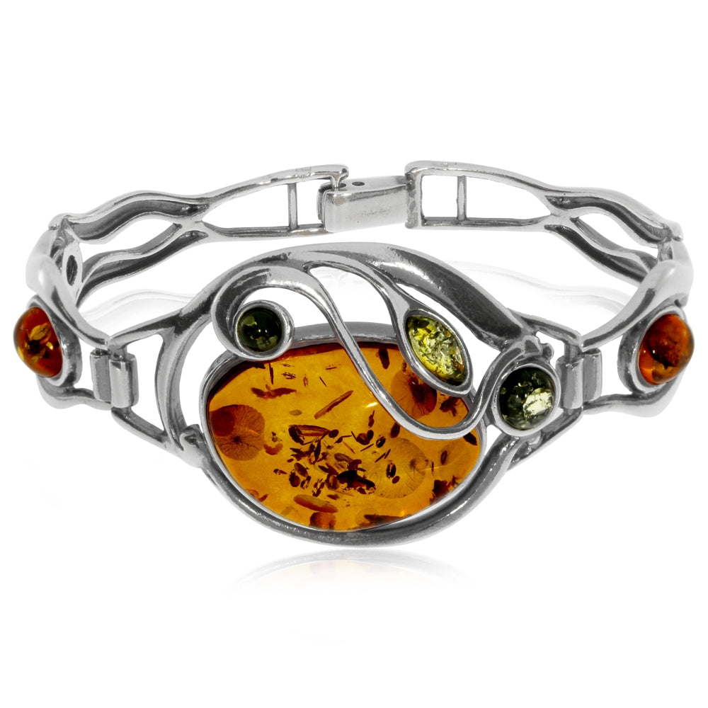 Stříbrný náramek pevného obručového typu je na středu ozdoben velkým jantarem oválného tvaru barvy koňaku. Tento centrální kámen doprovázen jemnými kulaltými a oválnými kousky jantaru jiných barev. Celkově náramek působí velmi ladně a to i přes asymetričnost tvarů. Výjimečnost tohoto jantarového šperku je patrná na první pohled.