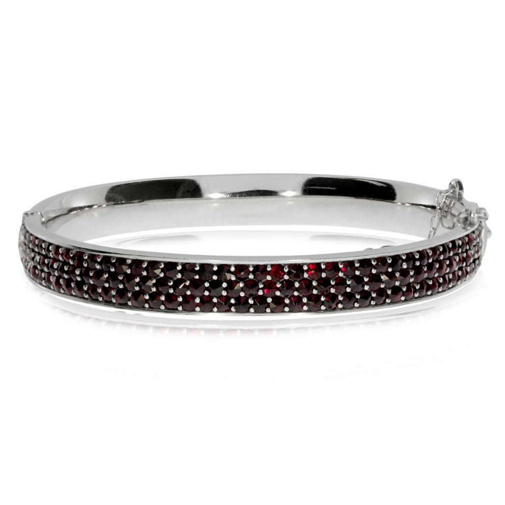 Luxusní pevný náramek s českými granáty ve třech řadách po celém obvodu okouzlí dokonalou klenotnickou prací mistů z družstva umělecké výroby Granát Turnov. Vnitřní strana náramku je mírně zaoblená, dokonale vyleštěná a pokryta lesklým rhodiem. Náramek má spolehlivý zámek, pojistný řetízek a otvírá se pohodlně s pomoci pevného kloubu. Výrobce přikládá ke šperku certifikát pravosti a krabičku s se svým logem.