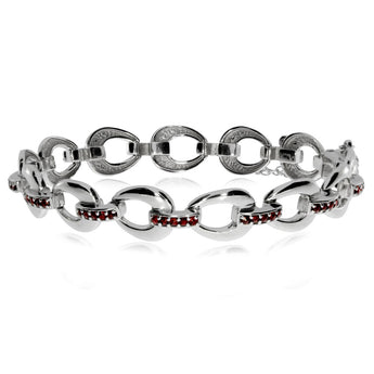 Výraznější stříbrný náramek s nepravidelně oválnými oky má spoje zdobené broušenými českými granáty. Stříbro o ryzosti 925/1000 je povrchově rhodiované ve vysokém lesku a tvoří tak velmi působivý kontrast k tmavě rudému granátu. Spoje ok jsou velmi hustě osázené přírodními českými granáty. Kameny mají kulatý hvězdový brus, který dává vyniknout barvě a lesku granátu. Tento český granátový šperk byl vytvořen v klenotnických dílnách družstva umělecké výroby Granát Turnov a je dodáván s certifikátem pravosti výrobce.