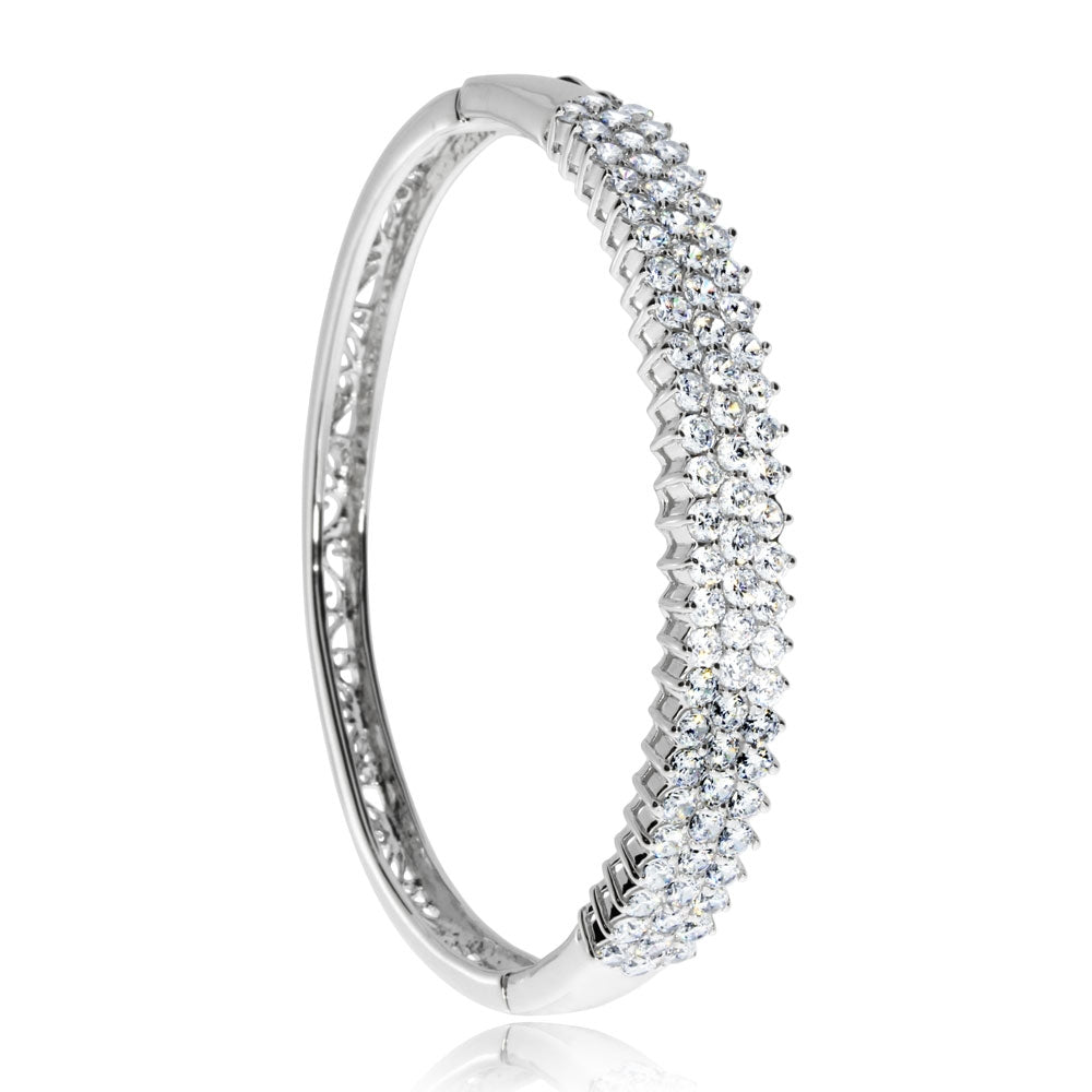 Luxusní a bohatě zdobený dámský náramek potěší každou dámu, která ráda zdůrazní svou jemnost. Je vyrobený z rhodiovaného stříbra, které se pyšní výrazným leskem a vysokou odolností. Celá jeho přední část je osázená krásně třpytivými kameny (cubic zirconia), zadní část je potom ozdobená zajímavým motivem. Náramek má pevnou velikost i tvar.