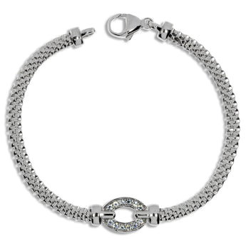 Působivě zpracovaný dámský náramek s nadčasově elegantním půvabem, který skvěle doplní různé módní styly a hodí se i pro každodenní nošení. Náramek je vyrobený z odolného a lesklého rhodiovaného stříbra a zdobí ho ovál posetý třpytivými syntetickými zirkony (cubic zirconia).