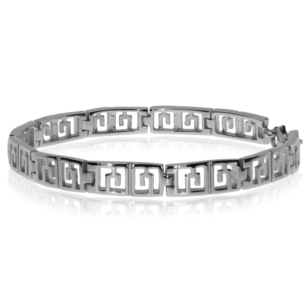 Originální a velice pěkně zpracovaný dámský náramek je složený z obdélníkových dílků, ve kterých je vyrobrazený motiv řeckého meandru. Jeho jednoduchá geometrie skvěle vyniká v povrchu rhodiovaného stříbra.