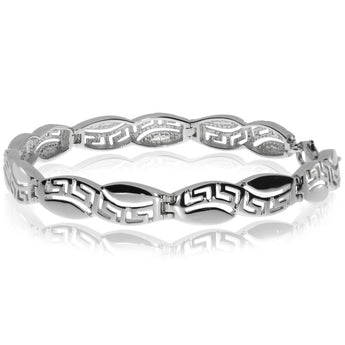 Tento stříbrný náramek nese velice originálně a netradičně zpracovaný oblíbený řecký vzor. Náramek je vyrobený z rhodiovaného stříbra, jehož povrch je odolnější a také se pěkně leskne. Nabízíme vám ho v různých délkách.