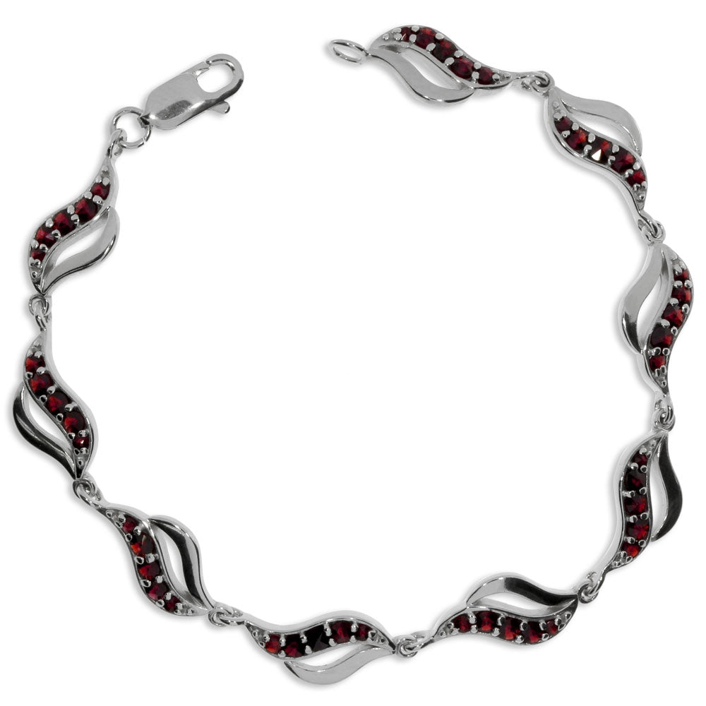 Stříbrný náramek se zapínáním na karabinu je složený s jemných článků esovitě prohnutých liníí, které jsou ozdobené broušenými českými granáty. Elegantní náramek je na povrchu pokryt lesklým rhodiem a tvoří součást soupravy šperků shodného designu. Tento český granátový šperk je vhodný pro slavnostnější společenské příležitosti. Byl vyroben v klenotnickém družstvu umělecké výroby Granát Turnov a je dodáván s certifikátem pravosti a v krabičce s logem výrobce.