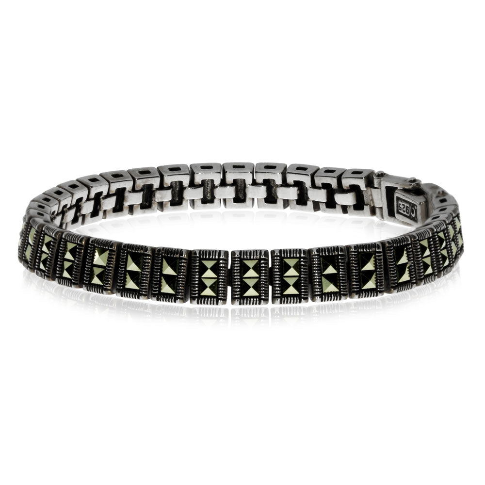Krásný náramek, který je jako stvořený pro každou dámu, která má ráda nápadité šperky. Skvěle se hodí pro každodenní nošení i slavností okamžiky. Náramek je posetý čtvercovými markazity, vyhledávanými pro elegantní kovový lesk. Celou kompozici potom ozvláštňuje starostříbrná úprava povrchu.