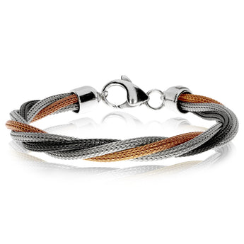 Nadčasově elegantní a velice působivě zpracovaný dámský náramek s osobitým půvabem, který bude skvělou ozdobou pro ženy a dívky se zájmem ve všem originálním a jedinečném. Náramek tvoří tři stříbrné kulaté pleteniny, každá s jinou povrchovou úpravou. Povrch první pokrývá vrstva ruthenia, povrch druhé vrstva rhodia a povrch třetí je zlacený. Vzniká tak pozoruhodná a moderní kombinace tří lesklých vzácných kovů různých barev, které navíc zvyšují odolnost stříbra.