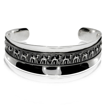 Originálně zpracovaný dámský náramek s netradičním půvabem, který zaujme ženy a dívky s osobitým stylem. Po jeho obvodu je vyobrazená karavana velbloudů. Náramek pevného typu je vyrobený z kvalitního stříbra se starostříbrnou úpravou. V té skvěle vynikají jednotlivé detaily orientálního motivu.