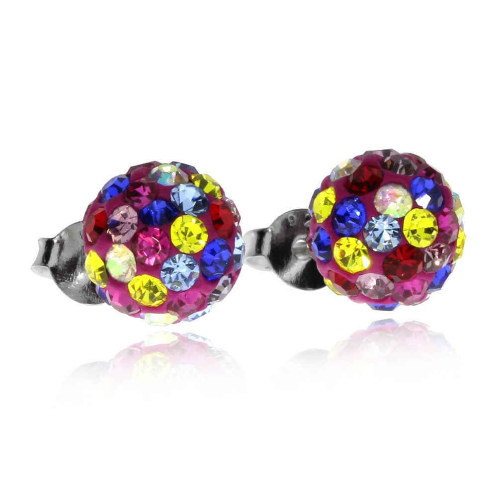 Středně velké dámské bodové náušnice jsou vyrobené ze stříbra a nesou jednoduchý kulatý tvar. Tento druh náušnic si stále získává velkou oblibu. Netradičně zpracované kuličky růžové barvy jsou celé osázené různobarevnými krystaly a vzniká tak kompozice spojující hravost a umírněnou zdobnost do jednoho celku.