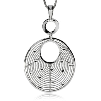 Větší stříbrný přívěsek, který mnohonásobně opakuje motiv kruhu. Jemné linie soustředných kruhů jsou ozdobeny ploškami výbrusů, které se při pohybu šperku nápadně lesknou. Přívěsek bude skvěle působit na černém podkladu a mohl by být nepřehlédnutelnou ozdobou své majitelky.