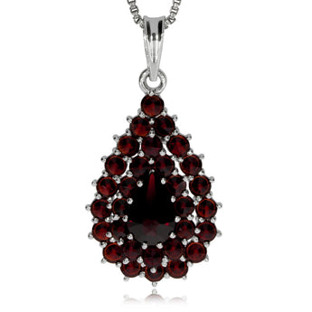 Výrazný přívěsek z rhodiovaného stříbra má tvar kapky. Přívěsek nese ve svém středu větší granát almandin broušený do tvaru kapky. Po obvodu jsou zasazené dvě řady kulatých broušených českých granátů, v celkovém počtu třiceti kamenů. Všechny kameny jsou zasazené do krapen, tedy bez obruby a nádherná barva granátu tak skvěle vyniká. Přívěsek má jednoduchý leštěný závěs s jemnou prohlubní. Tento český granátový šperk byl vyroben klenotníky v družstvu umělecké výroby Granát Turnov a je dodáván s certifikátem výrobce a v krabičce s jeho logem.
