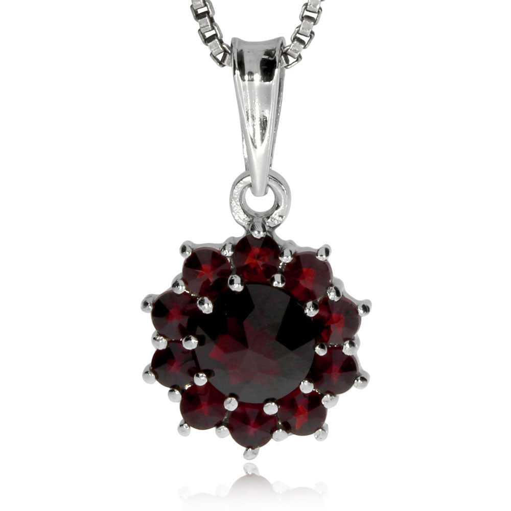 Český granátový šperk - stříbrný přívěsek nese ve svém středu větší broušený granát almandin, po jeho obvodu jsou v jemných krapnách zasazené kulaté české granáty. Decentní šperkařská práce mistrů z družstva umělecké výroby Granát Turnov dává vyniknout nádherné tmavě rudé barvě granátu. Přívěsek má v průměru více než jeden cm a je zavěšen na úchytu z lesklého rhodiovaného stříbra. Šperk je dodáván s certifikátem pravosti od výrobce a v krabičce s jeho logem.