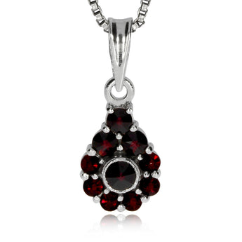 Stříbrný přívěsek ozdobený českými granáty a granáty almandiny má zvláštní tvar kombinující prvky kruhu a kapky. Větší středový granát almandin je zasazen do hladké obruby, která svojí tenkou linií zdůrazňuje kulatý tvar vybroušeného kamene. Drobné kameny zasazené po obvodu tvoří tvar kapky zajímavým využitím různě velkých granátů. Celý přívěsek je zavěšen na jednoduchém leském úchytu. Tento český granátový šperk byl vytvořen v d.u.v. Granát Turnov a je dodáván s certifikátem pravosti.