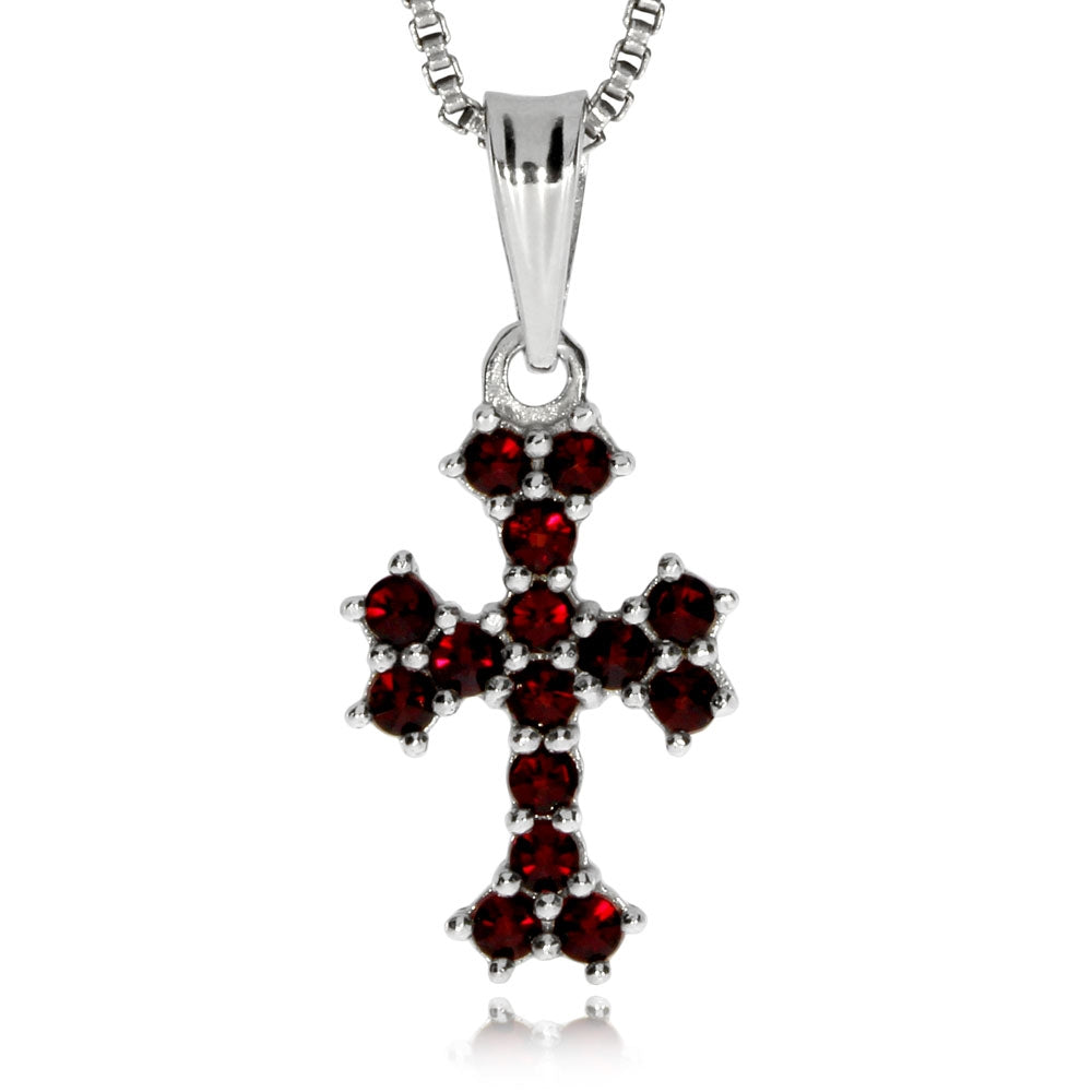 Menší přívěsek z rhodiovaného stříbra nese symbol kříže, jehož ramena jsou rozšířená a osazená českými granáty. Kamínky jsou vybroušené kulatým hvězdovým brusem a jsou zasazené velmi těsně vedle sebe. Jejich uchycení malými krapnami představuje jemný zdobný prvek. Přívěsek má delší leštěný úchyt, který umožní provléknout i silnější řetízek. Tento šperk s českými granáty je od výrobce d.u.v. Granát Turnov provázen certifikátem pravosti a krabičkou s jeho logem.