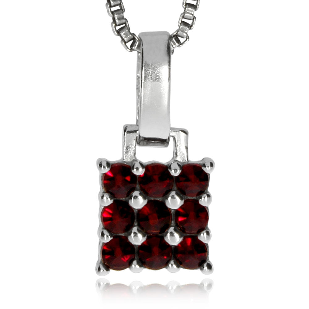 Drobný stříbrný přívěsek dává vynikout temně rudé barvě českého granátu. Devět kamínků vybroušených kulatým hvězdovým brusem je zasazeno do tvaru jednoduchého čtverce bez obruhy. Přívěsek je vybaven s delším leštěným úchytem. Tento drobný granátový šperk je z dílen d.u.v. Granát Turnov a při jeho zakoupení obdržíte certifikát pravosti.