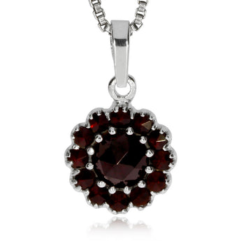 Drobnější kulatý přívěsek ze stříbra o ryzosti 925/1000 se pyšní ve svém středu větším dokulata vybroušeným granátem almandinem. Po jeho obvodu jsou zasazené malé české granáty v celkovém počtu dvanácti kamínků vybroušených kulatým hvězdovým brusem. České granáty jsou uchycené pomocí početných krapen, které vytvářejí jemný zoubkovaný okraj celého šperku. Přívěsek má jednoduchý lesklý úchyt, kterým projde si silnější řetízek. Tento český granátový šperk byl vytvořen v družstvu umělecké výroby Granát Turnov a je dodáván s certifikátem pravosti od výrobce.