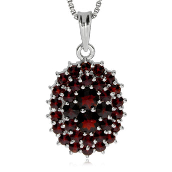 Větší stříbrný přívěsek oválného tvaru je hustě osazen broušenými českými granáty a většími granáty almandiny, které jsou umístěné uprostřed přívěsku. Všechny granáty jsou vybroušené kulatým hvězdovým brusem, který dává vyniknout temně rudé barvě granátu a jeho lesku. Přívěsek je vhodný pro každodenní nošení a není obtížné k němu postupně vytvořit celou soupravu šperků s českými granáty. Jedná se o velmi typický český granátový šperk, který je z klenotnických dílen družstva umělecké výroby Granát Turnov. Výrobce šperk provází certifikátm pravosti a rovněž krabičkou s firemním logem.