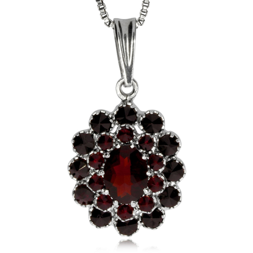 Dámský stříbrný přívěsek s českými granáty a almandiny má klasický design českého granátového šperku . Větší středový kámen je přírodní granát almandin vybroušený do oválného tvaru a po jeho obvojdu jsou české granáty s alamandiny ve dvou řadách stupňovitě zasazaných kamenů. Celková výška tohoto grantátového šperku je včetně úchytu téměř 3 cm. Lesklé jednoduché ouško přívěsku je dost velké, aby jím prošel i silnější řetízek. Tento dámský granátový přívěsek byl vytvořen v družstvu umělecké výroby Granát Turnov a je dodáván s certifikátem pravosti od tohoto výrobce.