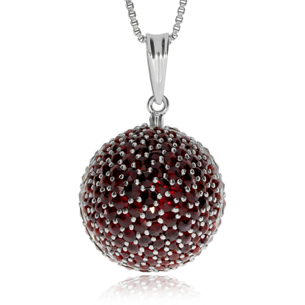 Dámský stříbrný přívěsek - dutá koule hustě osazená broušenými českými granáty je nesmírně efektním šperkem. Velký počet českých granátů je vybroušen kulatým hvězdovým brusem a kameny jsou zasazeny pomocí jemných krapen, které šperk prosvětlují. Přívěsek je vybaven jednoduchým leštěným úchytem, který je dostatečně velký i na silnější řetízek. Tento moderní český granátový šperk byl vytvořen mistry klenotníky z družstva umělecké výroby Granát Turnov a je dodáván s garancí pravosti od výrobce.