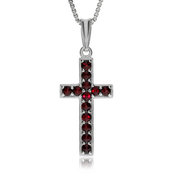 Klasický katolický kříž je vyroben ze stříbra o ryzosti 925/1000 s povrchovou galvanizací rhodiem zasazené broušené české granáty. Drobné kamínky jsou vybroušené kulatým hvězdobým brusem a uchycené do rovné obruby pomocí malých krapen. Granáty jsou zasazené těsně vedle sebe a tím je umocněn efekt granátu. Přívěsek má delší leštěný úchyt, který délku přívěsku zvětšuje až na celkových 3,2 cm. Tento granátový šperk byl vytvořen klenotníky v družstvu umělecké výroby Granát Turnov a je dodáván s certifikátem pravosti.