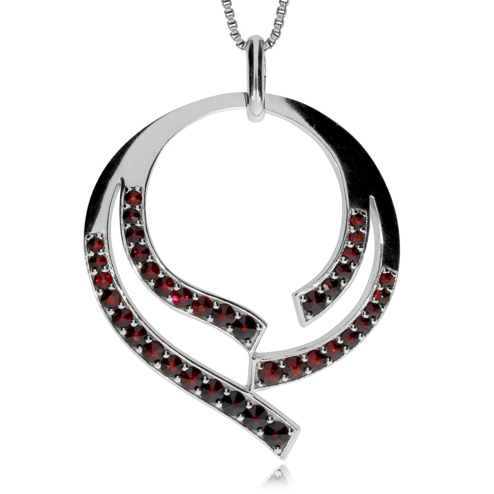 Granátový přívěsek má zajímavý moderní design. Dvě neuzavřené kruhové linie elegantního tvaru jsou jsou osazené téměř čtyřiceti českými granáty vzestupné velikosti. Drobné kamínky jsou vybroušené kulatým hvězdobým brusem a jsou uchycené do jemných linií pomocí malých krapen. Půvabný granátový šperk moderního designu byl vytvořen v družstvu umělecké výroby Granát Turnov a při jeho zakoupení obdržíte certifikát pravosti od výrobce.