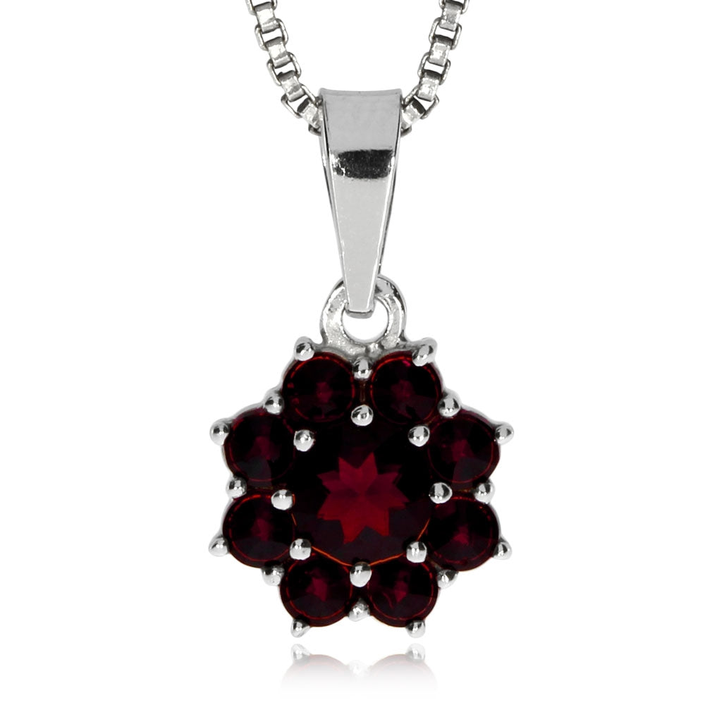 Drobný stříbrný přívěsek připomíná malou kytičku - kolem většího přírodního granátu almandinu kulatého tvaru je zasazeno osm českých granátů vybroušených kulatým hvězdovým brusem. Tento tvar je typický pro klasické české granátové šperky, které pocházejí z mistrovských dílen družstva umělecké výroby Granát Turnov. Stříbro o ryzosti 925/1000 je na povrchu pokryté rhodiem s vysokým leskem. Při zakoupení tohoto granátového šperku obdržíte certifikát pravosti od výrobce.