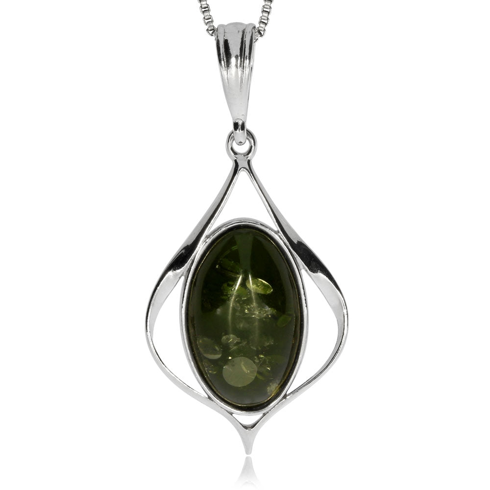 Stříbrný rhodiovaný přívěsek elegantních a vzdušných linií nese ve svém středu oválný zelený jantar. Lesklé rhodiované stříbro přitažlivě kontrastuje s barvou jantaru. Přestože je tento stříbrný šperk jednoduchý, jeho vyvážený design ho předurčuje i pro slavnostnější příležitosti.