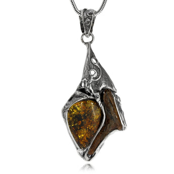 Nevšední přívěsek z patinovaného stříbra o ryzosti 925/1000 nese tmavší baltský jantar. Na přívěsku je uplatněn jako zdobný prvek i kousek dřeva. tím je podtržen rustikální vzhled šperku. Velikost přívěsku a jeho hmotnost vyžadují silnější řetízek, který snadno projde ozdobeným očkem.