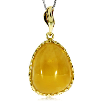 Větší, nepravidelně oválný jantarový kámen, má světle žlutou medovou barvu, která patří v současnosti k nejvíce oblíbeným. Vyleštěný jantar je zasazen do jemné vroubkované obruby z pozlaceného stříbra. Elegantní tvar přívěsku dotváří lehce prohnuté očko na řetízek.