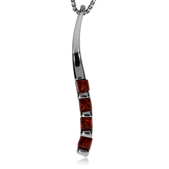 Krásně zpracovaný a jednoduše elegantní dámský přívěsek, který zaujme svou jemností a nápaditým zpracováním. Přívěsek tvoří jednoduchá stříbrná linie, do které jsou vsazené čtyři zlatavé jantary. Vyrobený je ze stříbra jehož povrch je potažený vrstvou odolného a pěkně lesklého rhodia. To, na rozdíl od stříbra, neoxiduje.