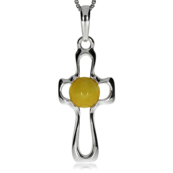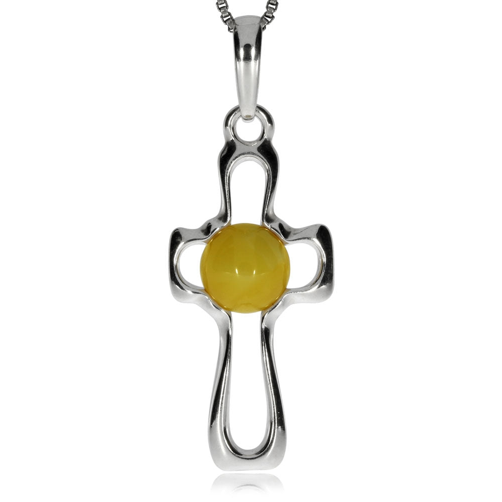 Krásně zpracovaný přívěsek s hravým designem je vyrobený z kvalitního leštěného stříbra. Ve středu kříže je zasazený dokulata opracovaný jantar žluté barvy, který se zářivým stříbrem vytváří zajímavou kombinaci.