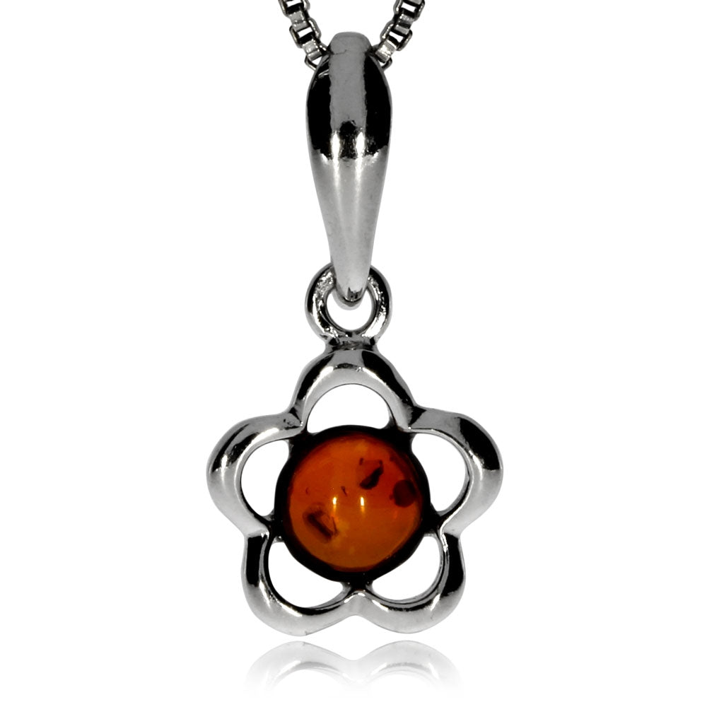 Drobný dámský přívěsek s něžným designem, který okouzlí každou romantickou ženu a dívku. Klasický motiv květiny doplňuje osazení zlatavým kulatým jantarem. Přívěsek je vyrobený z lesklého a dobře odolného rhodiovaného stříbra.