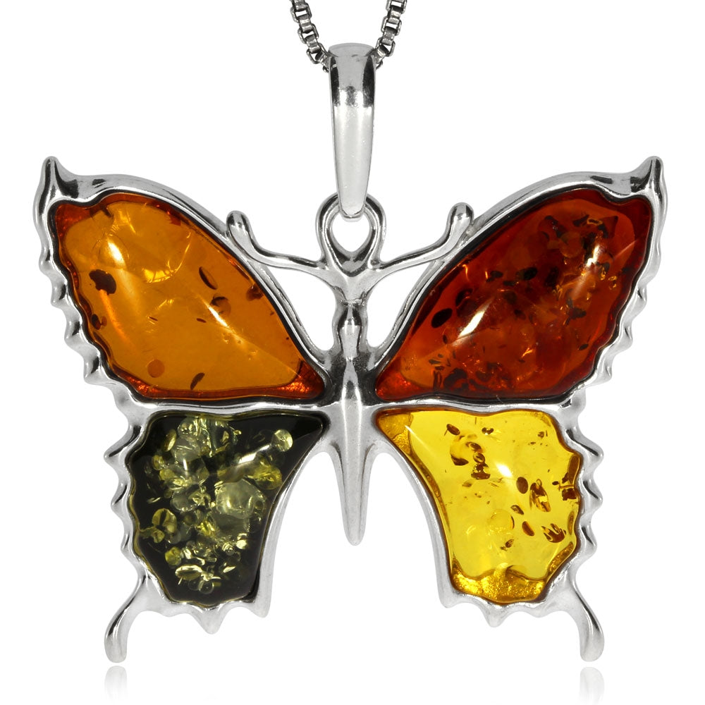 Stříbrný přívěsek s jantarem čtyř barev - Motýl