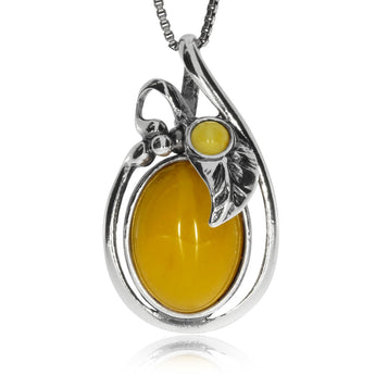 Stříbrný přívěsek - Žlutý jantarový ovál zdobený lístkem