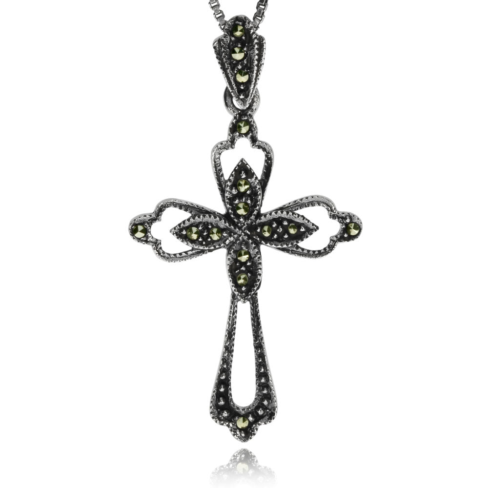 Okouzlující a velice jemně a zdobně zpracovaný dámský přívěsek ve tvaru křesťanského kříže. Přívěsek doplňuje povrchové zdobení a osázení kovově lesklými polodrahokamy markazity. Oba tyto zdobné prvky jsou skvěle znát ve starostříbrné povrchové úpravě.