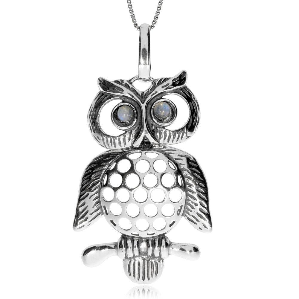 Nápadný stříbrný přívěsek v podobě sovy má výšku přesahující šest centimetrů a hmotnost více než 10 gramů. S těmito faktory je třeba počítat při výběru řetízku - měl by být delší a zejména silnější. Sovička má zářivé oči z minerálu, pro který se vžil název měsíční kámen. Šperk se bude velmi pěkně vyjímat na tmavém podkladu oblečení, zejména s ohledem na výřezy, kterými může tmavá barva prosvítat.