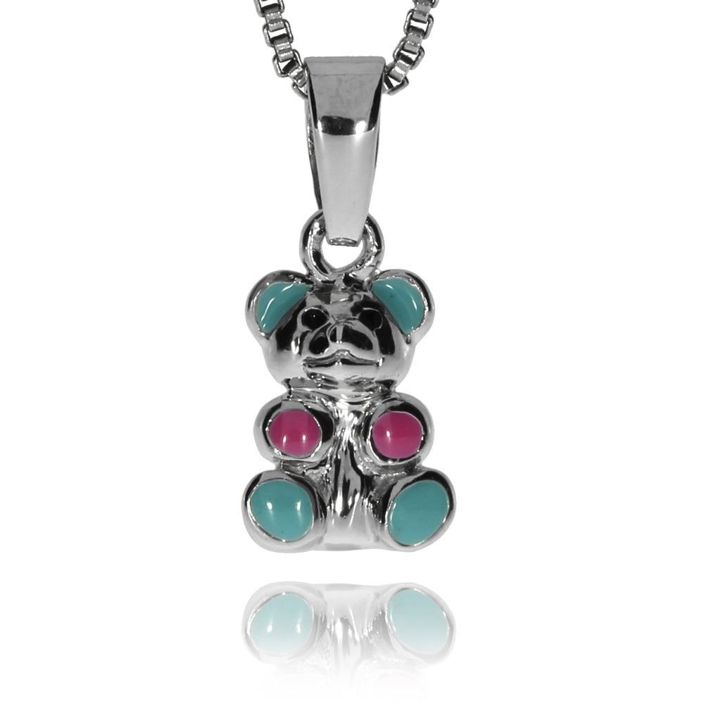 Originálně zpracovaný dětský přívěsek ve tvaru medvídka s velice hravým designem. Přívěsek je vyrobený z dobře odolného a krásně lesklého rhodiovaného stříbra a je ozdobený růžovými a zelenými smaltovými plochami.