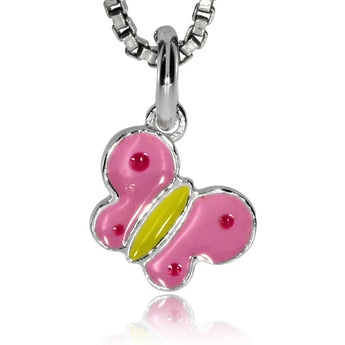 Dětský stříbrný přívěsek pro malé holčičky má podobu růžového motýlka. Koketní zavěšení za jedno křidélko bude malým parádnicím slušet.