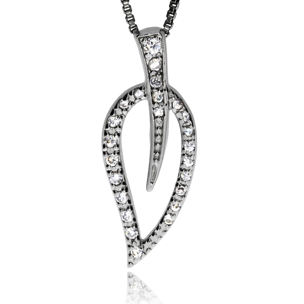 Půvabně jemný dámský přívěsek s jednoduchým přírodním motivem a elegantním zpracováním. Přívěsek představuje jednoduchý lístek a celá jeho linie je posetá třpytivými syntetickými zirkony (cubic zirconia), které nádherně září. Přívěsek je vyrobený z lesklého rhodiovaného stříbra.