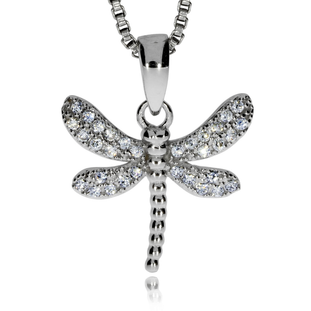 Tento decentní přívěsek potěší každou dámu, která má ráda jednoduchou eleganci a důmyslnou zdobnost nepříliš výrazných šperků. Drobný přívěsek vyobrazující vážku je vyrobený ze stříbra s rhodiovaným povrchem. Ten se tím těší nebývalému lesku a také odolnosti. Křídla vážky jsou osázené krásně třpytivými zirkony (cubic zirconia).