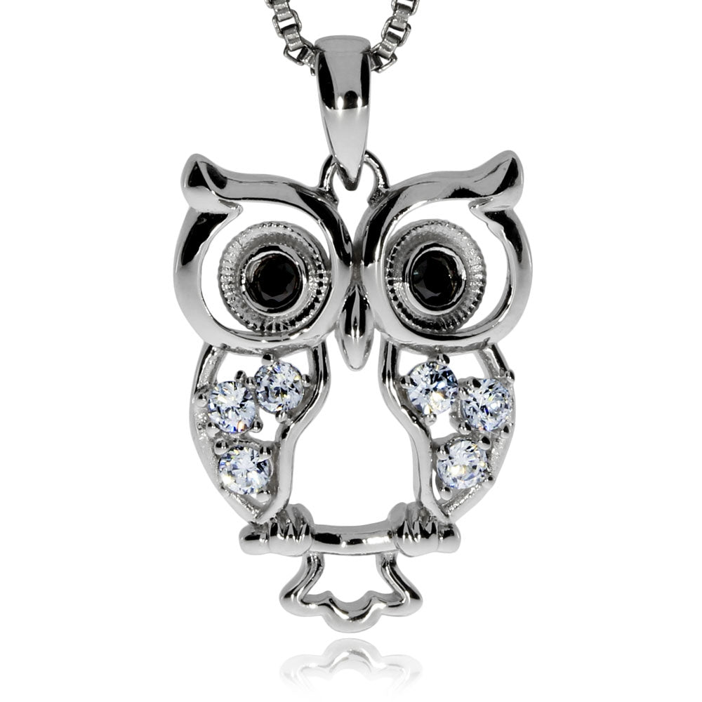 Tímto šperkem potěšíte každou dámu, která má ráda moderní trendy a motivy. Přívěsek představující sovu je vyrobený ze stříbra s rhiodovaným povrchem, ten mu propůjčuje odolnost, lesk a hladkost. Do kompozice je zasazeno šest čirých zirkonů (cubic zirconia) a oči potom tvoří dva černé kameny. Vzniká tak jemný a do detailů skvěle zpracovaný šperk.