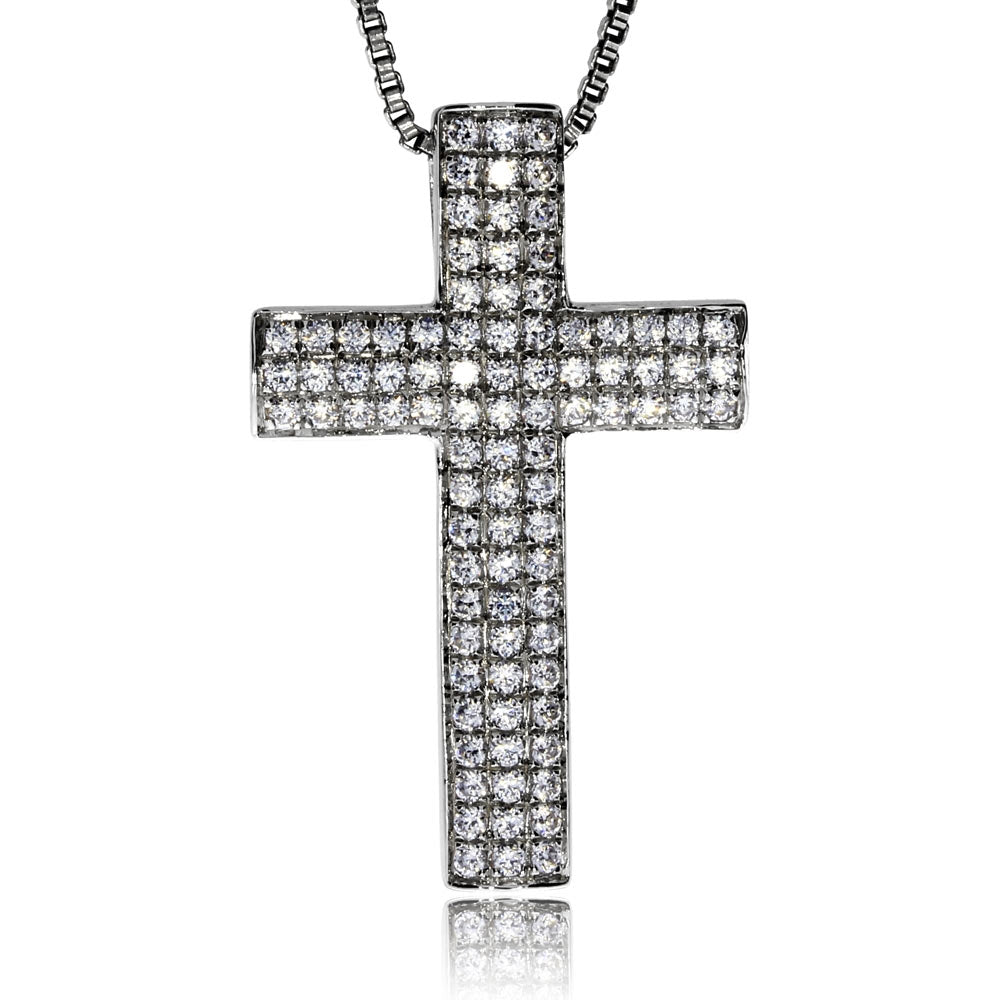 Půvabně zpracovaný dámský přívěsek s nesmrtelným motivem křesťanského kříže. Ten vyjadřuje víru a naději. Přívěsek je vyrobený z lesklého a dobře odolného rhodiovaného stříbra a zdobí ho osázení čirými syntetickými zirkony (cubic zirconia).