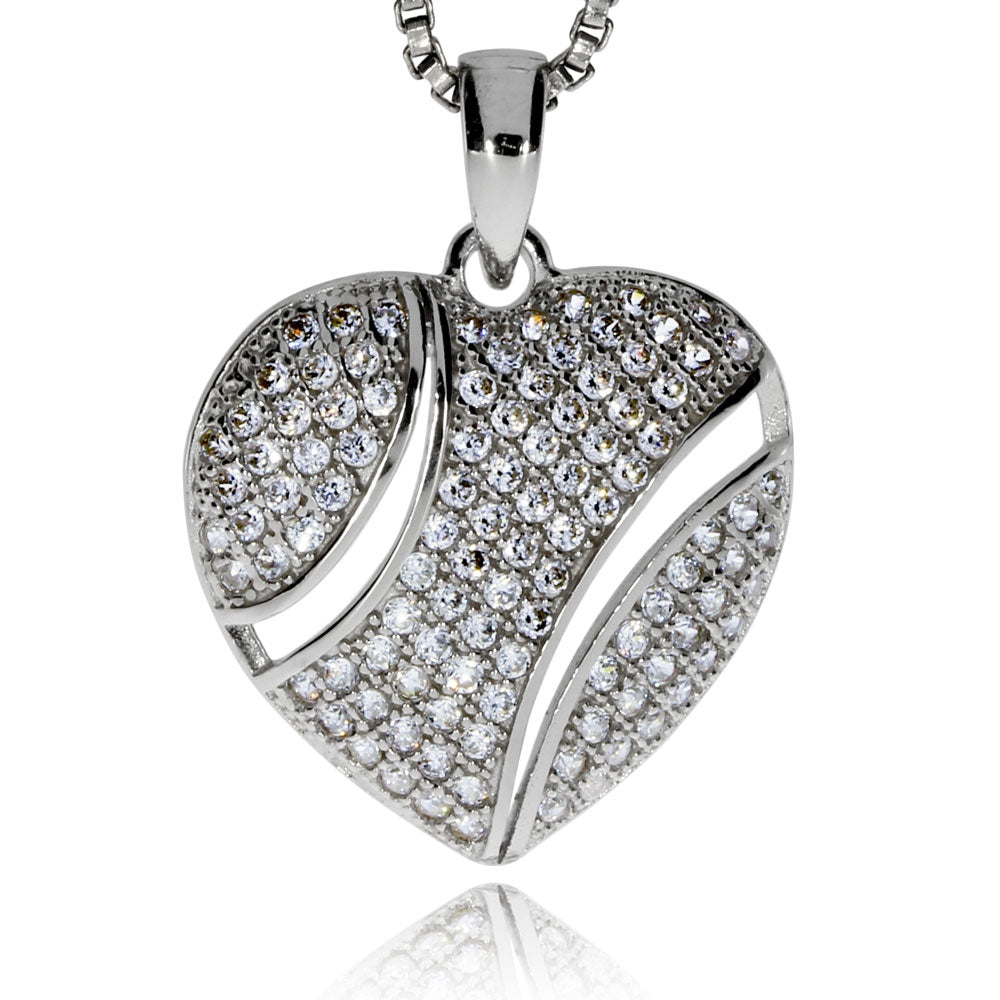 Na některá sdělení zkrátka slova nestačí. Vyznejte své city a vřelý vztah pomocí okouzlujícího šperku. Tento nádherný přívěsek ve tvaru srdíčka je vyrobený z lesklého rhodiovaného stříbra a bohatě osázený malými syntetickými zirkony (cubic zirconia). Celou kompozici potom ozvláštňují dva jemné průřezy.